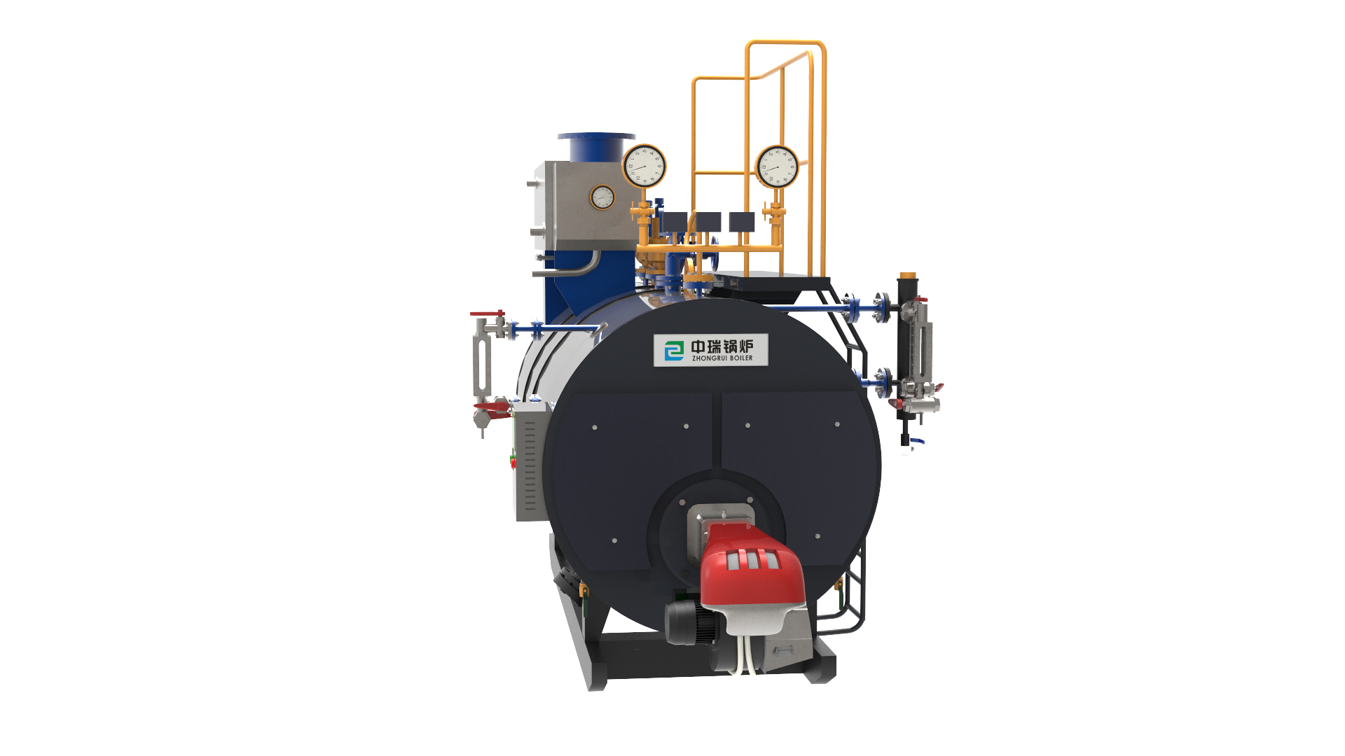 中瑞蒸汽鍋爐為機(jī)電一體化設(shè)備,它由鍋爐本體、燃燒器、電控柜、給水泵及管路閥門儀表等組成。機(jī)組配套了歐洲原裝進(jìn)口燃燒器,機(jī)組本體采用了臥式內(nèi)燃三回程濕背式的成熟結(jié)構(gòu)形式,燃料(油/氣)從燃燒器經(jīng)壓力霧化高速噴出,在爐膽內(nèi)呈微正壓燃燒,燃燒后的高溫?zé)煔庠跔t內(nèi)輻射換熱后轉(zhuǎn)向進(jìn)入第二回程煙管到前煙箱,再折轉(zhuǎn)180o度進(jìn)入第三回程煙管,經(jīng)后煙箱、冷凝器再排入煙囪進(jìn)入大氣。